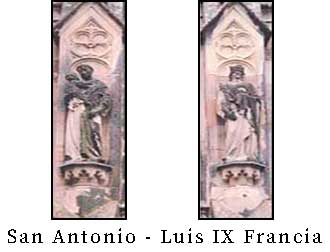 Y a cada lado, completando la composición en sendos doseles, coloco las imágenes de San Antonio y San Luis IX de Francia, posiblemente en relación a Don Antonio y D.ª Luisa. Estas dos obras las esculpió Joan Roig Soler.