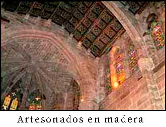 Los techos, están recubiertos de artesonados de madera de nogal, policromado, de dibujo cuadrifolio y otros diseños florales.